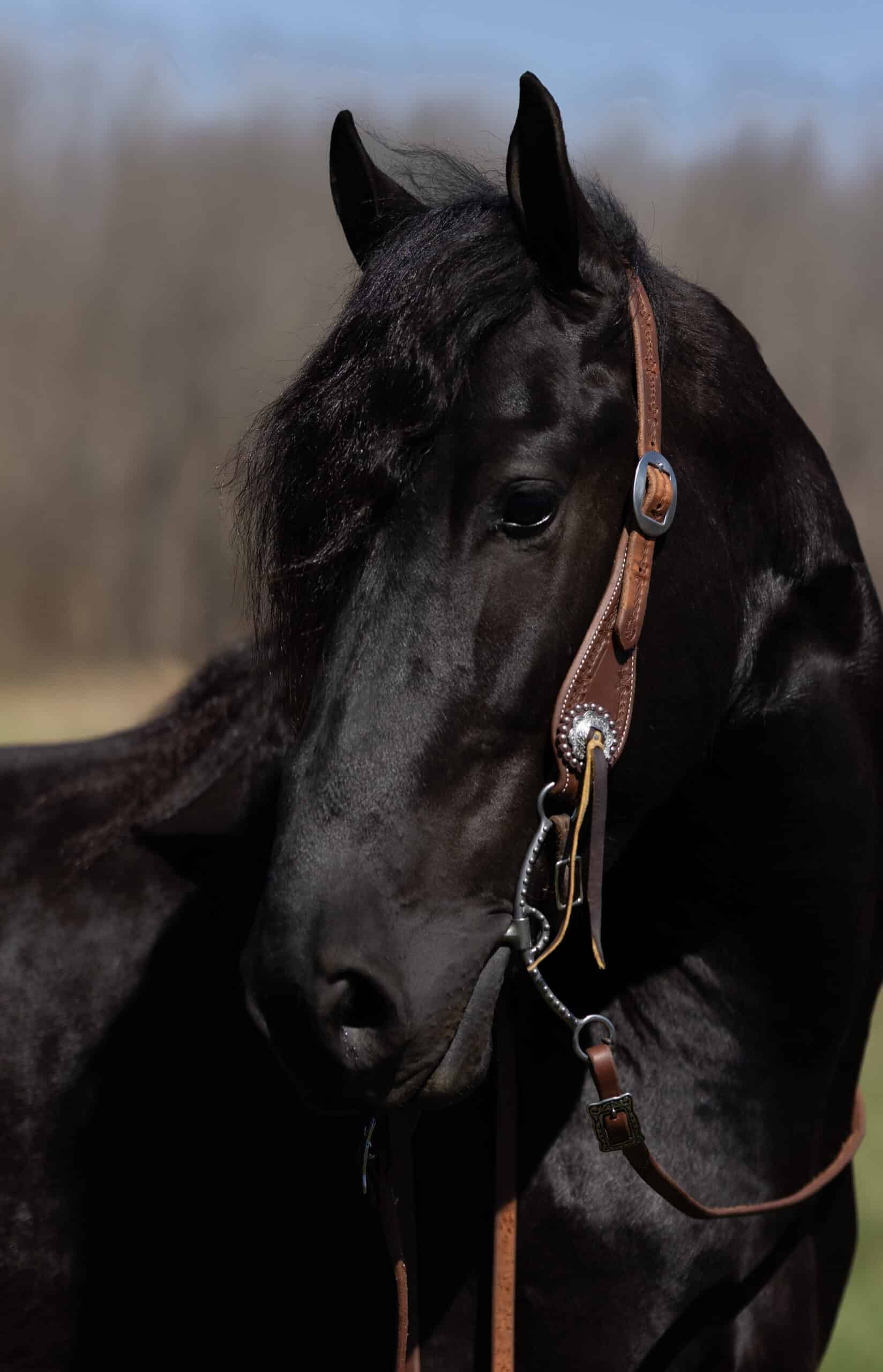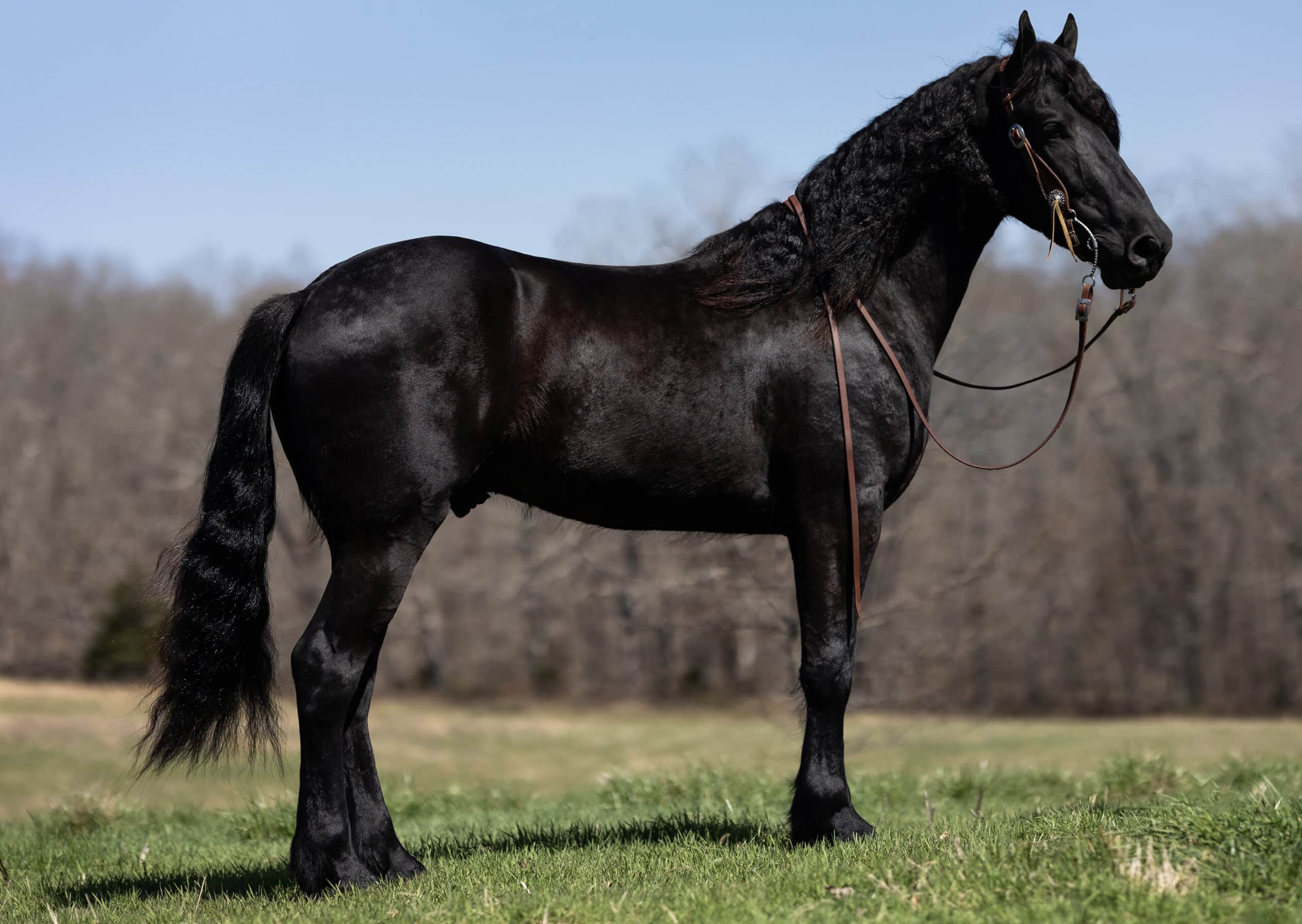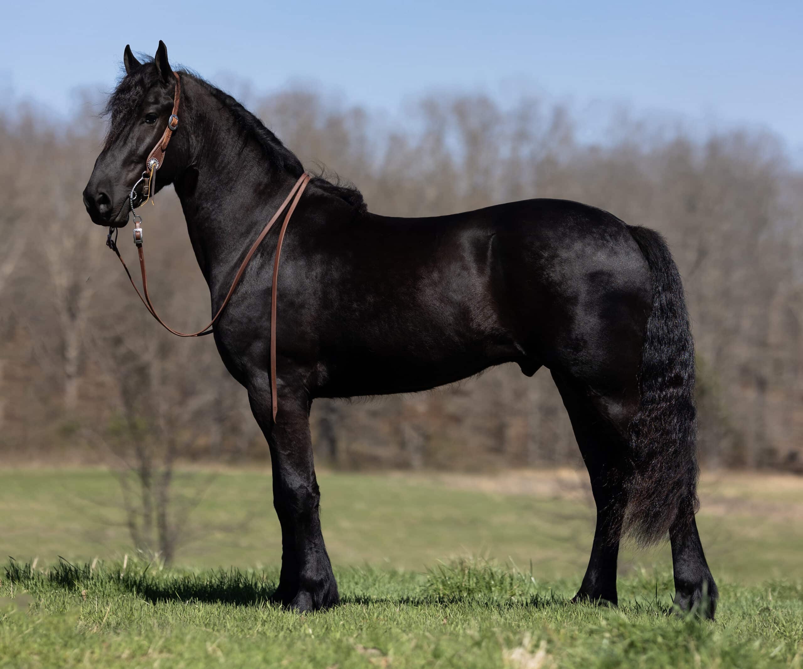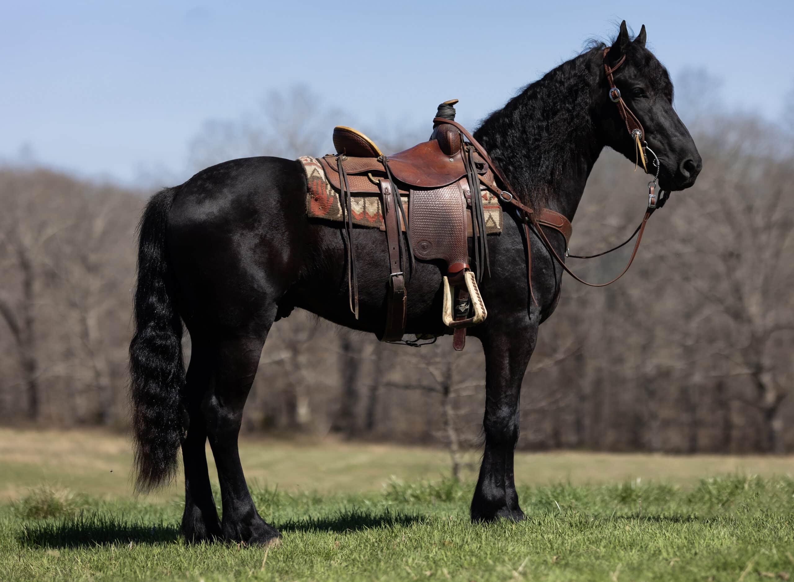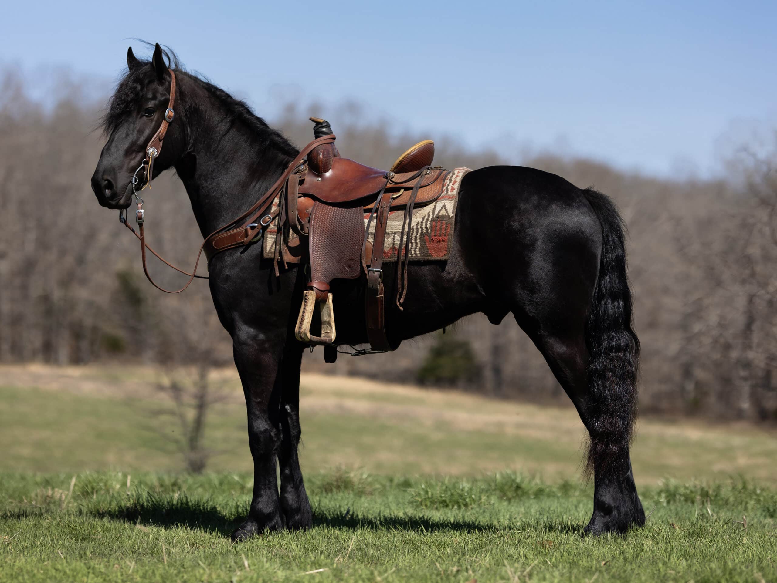 Some horses have a presence about them that is impossible to ignore, and Achilles is one of those rare individuals. Achilles is a beautiful and classy 5-year-old Friesian Cross gelding standing 15.2 hands tall, and he carries that truly majestic Friesian build and style that turns heads everywhere he goes. His natural elegance and striking appearance make a lasting impression, but what truly makes him special is his kind, patient nature and his incredibly gentle, laid-back mind. Achilles is the definition of safe and enjoyable, making him a wonderful choice for riders of all experience levels, including beginners. He is naturally laid back and not a forward mover, making him a perfect partner for someone who wants to relax and enjoy the ride. He is happy to walk along on a loose rein at whatever pace you ask, yet when you pick up on him, he responds willingly, stepping into a smooth trot and canter with beautiful, effortless movement. He travels with grace and softness that you can feel in every stride. He has been extensively trail ridden and is as seasoned and dependable as they come. Achilles is the same horse every time you step on him, whether it’s been a day or a week. He crosses water, logs, and any obstacle with confidence and will go anywhere you point him without hesitation. He is not spooky or silly in any way and handles the outside world with a calm, steady mind. He rides out alone just as confidently as he does in a group and is content in any position. He is not barn sour, not buddy sour, and truly enjoys his job. While Achilles is an incredible trail mount, he is just as enjoyable in the arena. He will walk, trot, and canter collected circles with ease, always picks up his leads, and stays soft and responsive to his rider. He moves nicely off leg pressure, will side pass, and has a good stop and back. Everything about him reflects a solid foundation and being started the right way. On the ground, Achilles is an absolute gentleman. He has impeccable manners, loves attention, and genuinely enjoys being groomed. He stands quietly to tack and bridle, ties patiently, and is respectful in every situation. He is great for the farrier and picks up all four feet with ease. He gets along well with other horses, whether turned out in pasture or kept in a stall, and adapts easily to any program. Achilles also loads and hauls like a dream, making him a stress-free addition wherever he goes. Horses with this kind of presence, mind, and rideability are hard to find, and Achilles is truly one that stands out in every way. He is the kind that will take care of his rider while still being enjoyable, versatile, and fun to own. For more information contact (573) 270-4490.